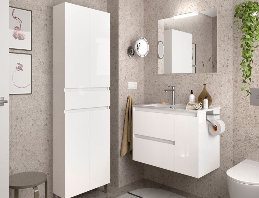 2) Moderne hängende Badezimmersäule aus Holz, weiß glänzend, mit zwei Türen mit Soft-Close und 4 Glaseinlegeböden.