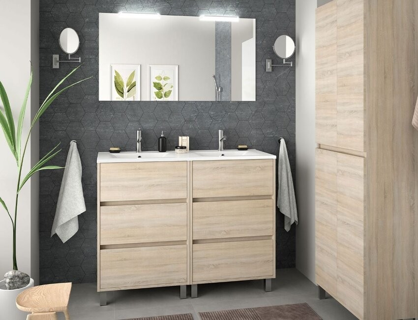 1) Moderner Badezimmerschrank aus Holz, Farbe Caledonia Braun, mit sechs Schubladen mit Soft-Close-Mechanismus. Integrierte Griffmulden an der Vorderseite des Möbels verbinden Funktionalität und Design. Front und Seiten aus 16 mm laminierter Spanplatte (Klasse E-1) mit PVC-Kanten (mit PUR-Leim). Füße mit polierter, eloxierter Oberfläche.
