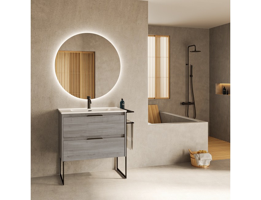 Erneuern Sie das Aussehen Ihres Badezimmers mit dem Badezimmerschrank Virginia. Das Produkt besteht aus einem Einbauwaschtisch und einem Schrank mit 2 Schubladen mit Soft-Close. Minimalistisch und entschlossen in seinen Linien. Der rechteckige Spiegel und die LED-Lampe sind ebenfalls erhältlich.