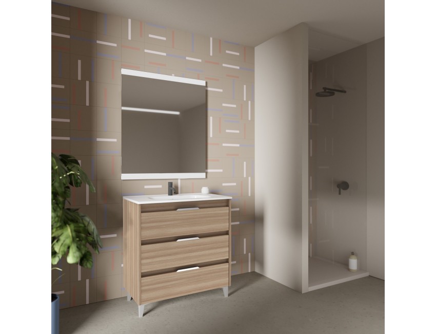 Erneuern Sie das Aussehen Ihres Badezimmers mit dem Badezimmerschrank Minnesota. Das Produkt besteht aus einem Einbauwaschtisch und einem Schrank mit 3 Schubladen mit Soft-Close. Minimalistisch und entschlossen in seinen Linien. Der rechteckige Spiegel und die LED-Lampe sind ebenfalls erhältlich.