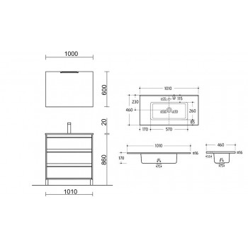 Waschtischabmessungen: B 101 x T 46 x H 1,9 cm (Badewannentiefe : 17 cm)