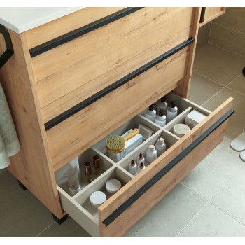 1) Moderner Badezimmerschrank Farbe Eiche ostippo, mit 3 Schubladen mit Softeinzug, für sanftes Schließen. Der charakteristische Muldengriff der Serie in mattschwarz verleiht Ihrem Bad einen eigenen Touch. Vorderseiten und Seitenteile werden aus 16 mm starken, laminierten Spanplatten (Klasse E-1) hergestellt mit PVC-Kanten (mit PUR-Kleber). 10 cm hohe Füße. Komplet mit zertifizierte hochwertige Beschläge