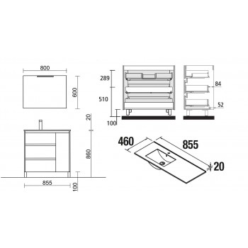 Waschtischabmessungen:  L 85,5 x P 46 x H 1,9 cm (Badewannentiefe: 13 cm)