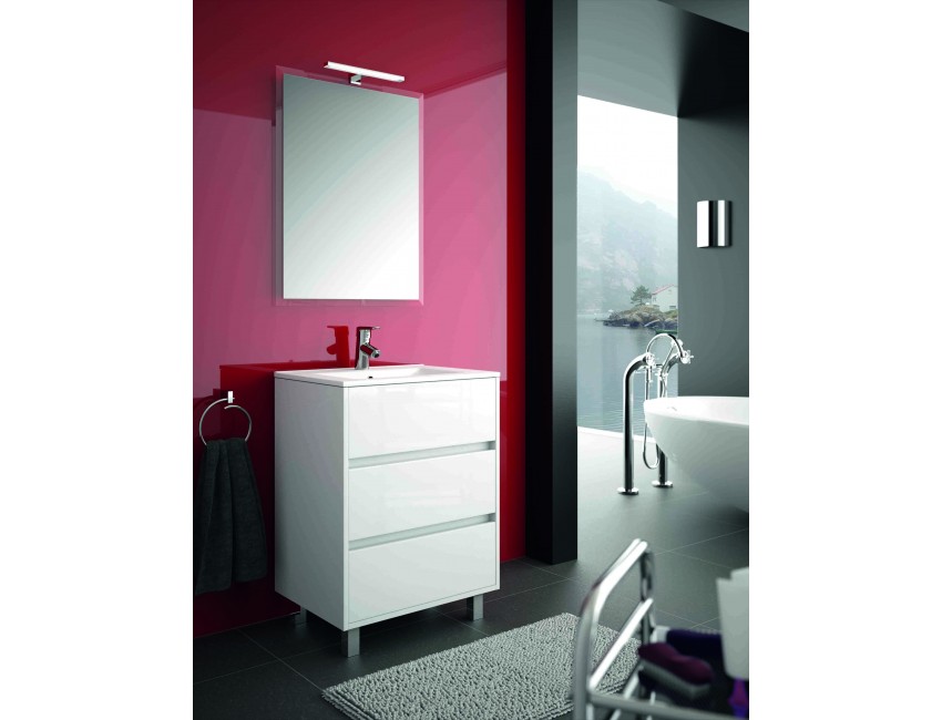 1) Moderner Badezimmerschrank aus glänzend weiß lackiertem Holz mit 3 Schubladen mit langsamer Schließung und Metallfüßen