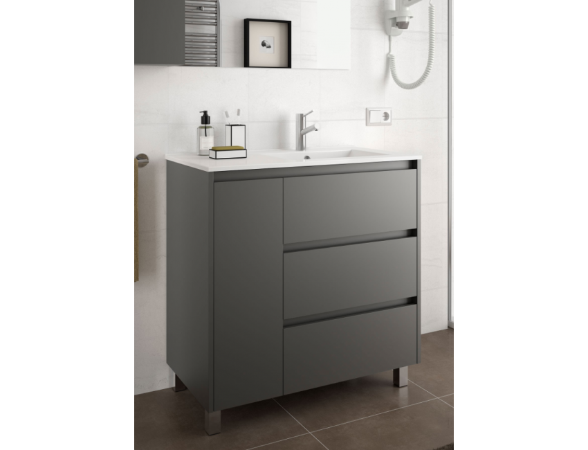1) Moderner Badezimmerschrank aus Holz, Farbe mattgrau, mit 1 Tür und 3 Schubladen mit langsamer Schließung und Metallfüßen.