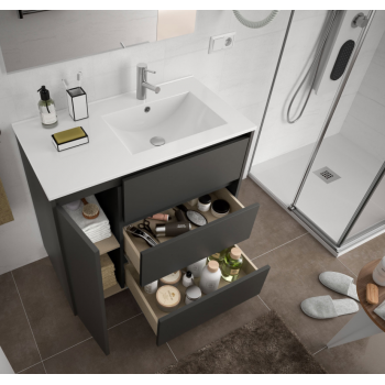 Badezimmer Badmöbel auf dem boden 85 cm aus mattgrauem Holz mit Waschtisch rechte Version