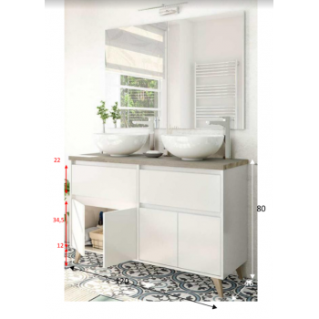 1) Bodenstehender Badezimmerschrank mit zwei oberen Schubladen (mit Siphonschutz) und vier Türen. Die Schubladen haben verdeckte Führungen mit progressivem Einzug, Soft Close. Der Schrank verfügt außerdem über eichenfarbene Abs-Füße und eine 30 mm starke Platte. Die Halterungen für die Wandmontage sind INKLUSIVE.