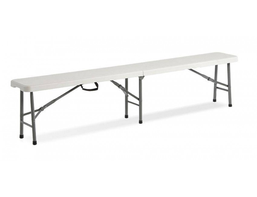 Panca per set birreria da giardino con gambe pieghevoli, struttura in ferro verniciata a polvere di colore grigio e seduta in HDPE (Polietilene Alta Densità) di colore bianco.