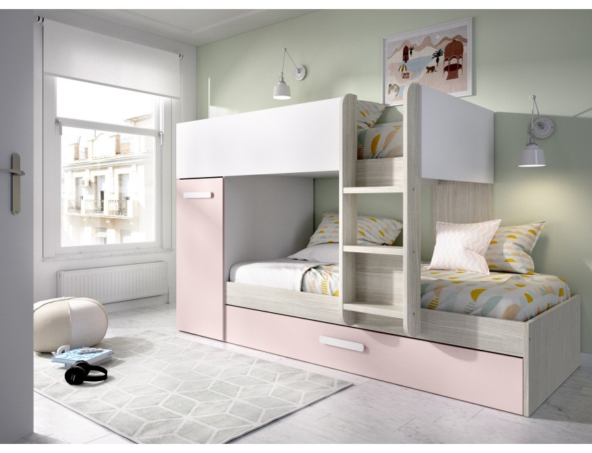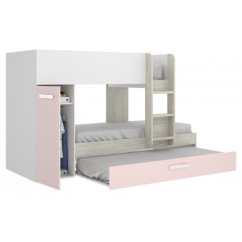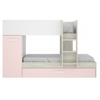 Etagenbett Crystal für zwei Kinder Mattweiß Rosa und Eiche Grau mit Kleiderschrank