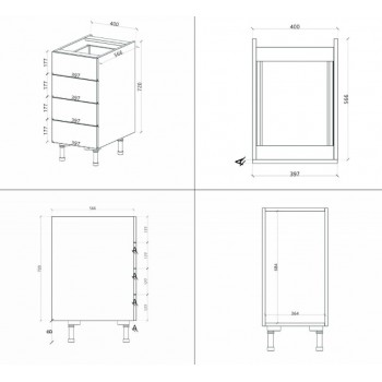 - 4 Schubladen aus lackierten Metallgriffen 86x450 mm