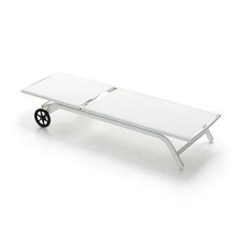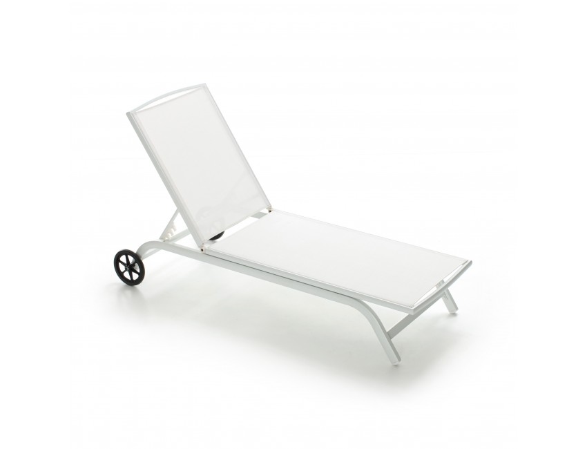 Lettino con ruote e schienale reclinabile su 4 posizioni, totalmente abbattibile. Struttura in alluminio verniciato a polvere colore bianco, rivestimento in textilene 2 X 2 colore bianco, confezione Kø Ingombro cm 200 X 62 X h 65/105.