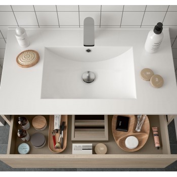 1) Moderner Badezimmerschrank Farbe braun Caledonia, mit 2 Schubladen mit Softeinzug, für sanftes Schließen. Der Muldengriff in der Schrankvorderseite vereint Funktionalität und Design. Eine Öffnung unten, perfekt zur Aufbewahrung persönlicher Hygieneartikel. Vorderseiten und Seitenteile werden aus 16 mm starken, laminierten Spanplatten (Klasse E-1) hergestellt mit PVC-Kanten (mit PUR-Kleber). Komplet mit zertifizierte hochwertige Beschläge