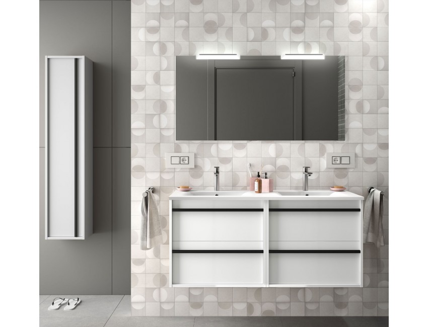 1) Moderner Badezimmerschrank Farbe glänzendes Weiß, mit 4 Schubladen mit Softeinzug, für sanftes Schließen. Der charakteristische Muldengriff der Serie in mattschwarz verleiht Ihrem Bad einen eigenen Touch. Vorderseiten und Seitenteile werden aus 16 mm starken, laminierten Spanplatten (Klasse E-1) hergestellt mit PVC-Kanten (mit PUR-Kleber). Komplet mit zertifizierte hochwertige Beschläge