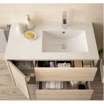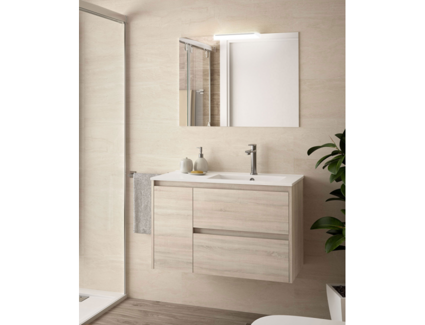 1) Moderner Badezimmerschrank Farbe Caledonia braun, mit 2 Schubladen und eine Tür mit Softeinzug, für sanftes Schließen. Der Muldengriff in der Schrankvorderseite vereint Funktionalität und Design. Vorderseiten und Seitenteile werden aus 16 mm starken, laminierten Spanplatten (Klasse E-1) hergestellt mit PVC-Kanten (mit PUR-Kleber).