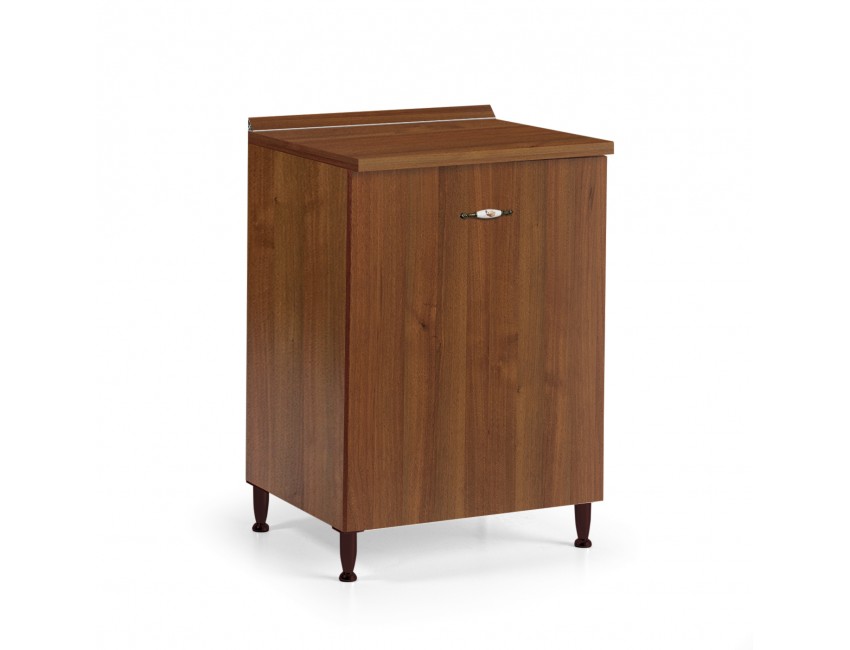 Base per cucina componibile interamente realizzata in legno e dotata di un'anta con maniglia cromata, un ripiano interno e piedini da appoggio