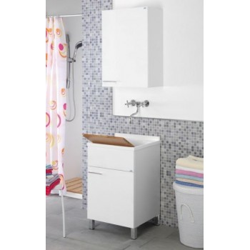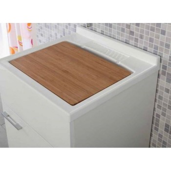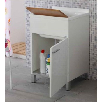 Lavatoio in nobilitato melaminico 18 mm frontale laccato bianco, completo di vasca in resina, sifone, tavoletta in bamboo e mensola rettangolare due ripiani con trattamento antipolvere e antiruggine.