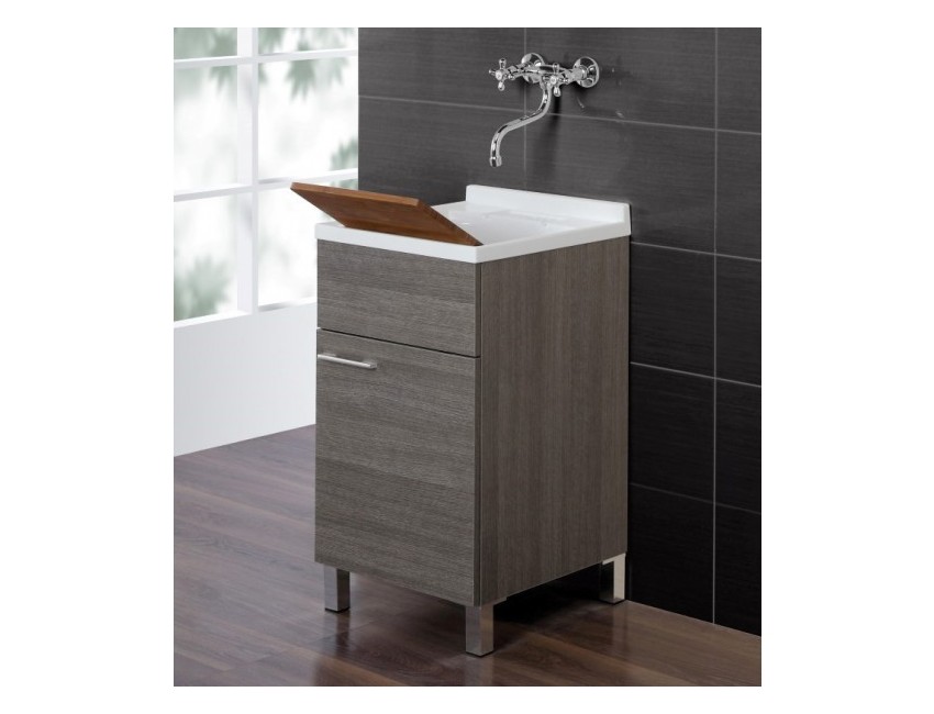 Lavatoio in nobilitato melaminico 18 mm rovere scuro, completo di vasca in resina, sifone, tavoletta in bamboo e mensola rettangolare due ripiani con trattamento antipolvere e antiruggine.