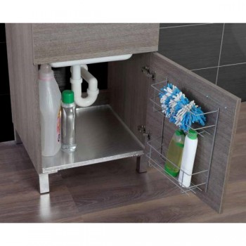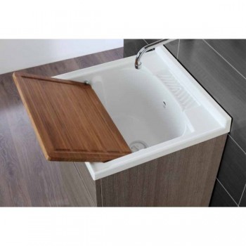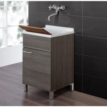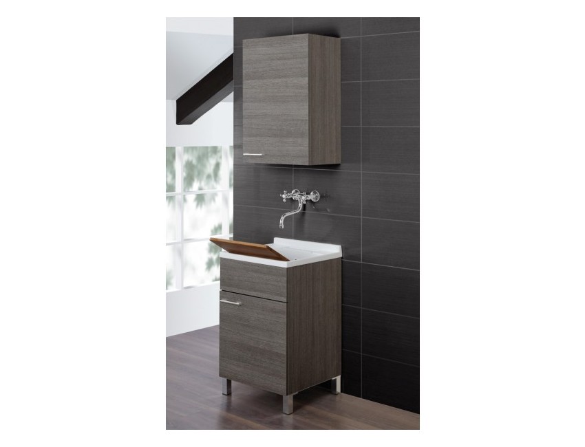 Lavatoio in nobilitato melaminico 18 mm rovere scuro completo di vasca in resina, sifone, tavoletta in bamboo e mensola rettangolare due ripiani con trattamento antipolvere e antiruggine.
