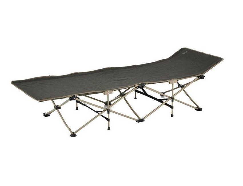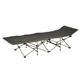 Lettino da giardino o campeggio pieghevole ad ombrello. La struttura è in ferro verniciato a polvere di colore beige, mentre il tessuto è in poliestere 600D Oxford spalmato in polietilene, colore verde scuro.