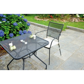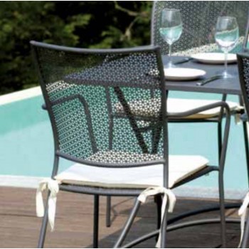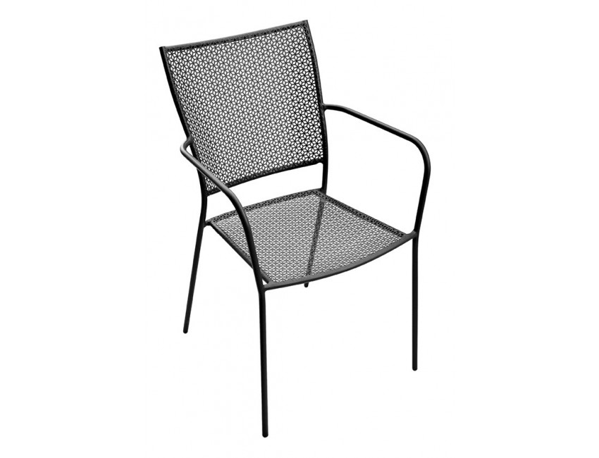Sedia in ferro Antracite traforata e facilmente impilabile. La sedia è munita di braccioli ed è trattata con vernice antiruggine. Perfetta se abbinata con cuscino ecrù (tessuto grezzo che mantiene il colore naturale delle fibre).