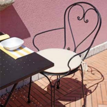 Sedia perfettamente abbinabile a tutti i tavoli in ferro. La sedia, munita di braccioli, è impilabile ed è realizzata interamente in ferro, colore nero; il prodotto è sottoposto a uno speciale trattamento antiruggine.