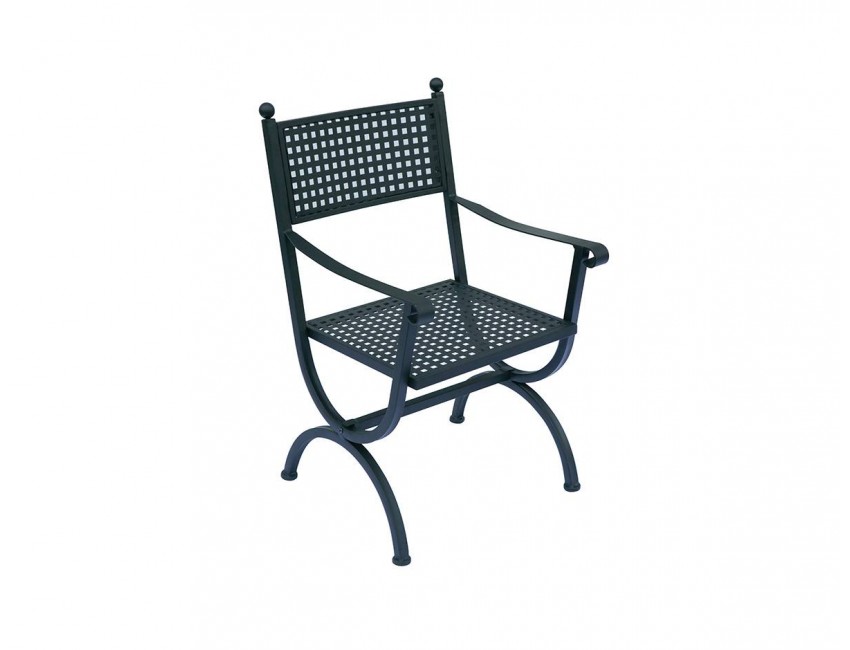 Sedia da esterno con braccioli, dal design solido e minimale. Il prodotto è caratterizzato da un mix di linee dritte e curve, è interamente realizzato in ferro di colore nero ed è trattato con speciali vernici antiruggine, per la protezione dagli agenti esterni. La sedia può essere acquistata con il relativo cuscino ecrù (materiale del colore originale delle fibre che lo compongono, senza trattamenti).