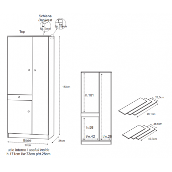 Kleiderschrank 77x183H cm Ulme hell mit drei Türen und einer Schublade