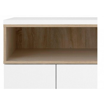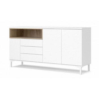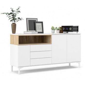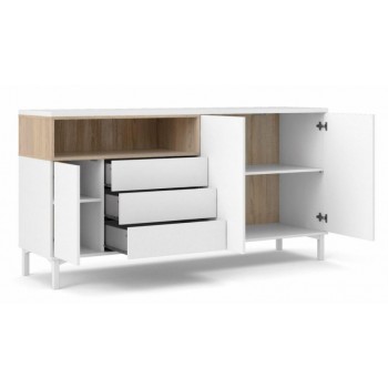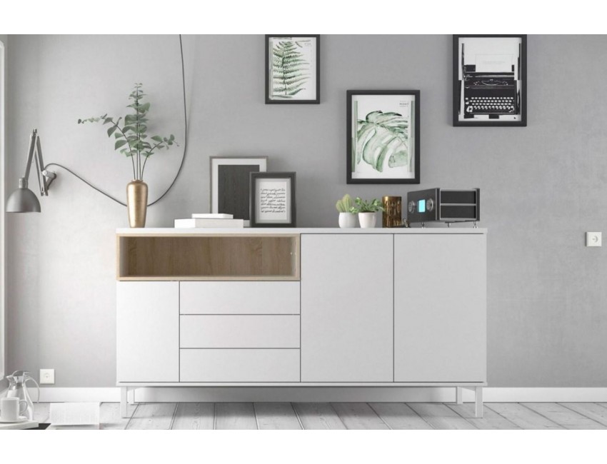 Wohnzimmeranrichte 175x89 cm Mattweiß und Eiche mit drei Türen und drei Schubladen