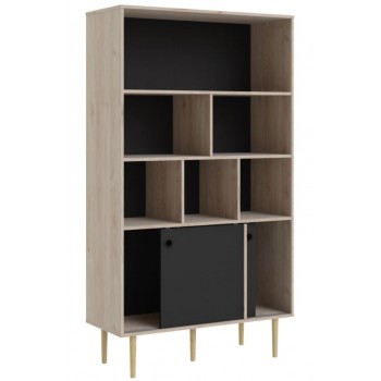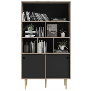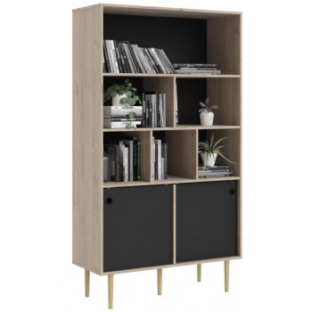 Bücherregal 175 cm Mattschwarz und Eiche mit zwei Schiebetüren und sechs Einlegeböden