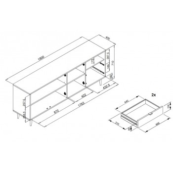 - Das Produkt verfügt über 2 Schubladen, 3 Türen und ein Fach