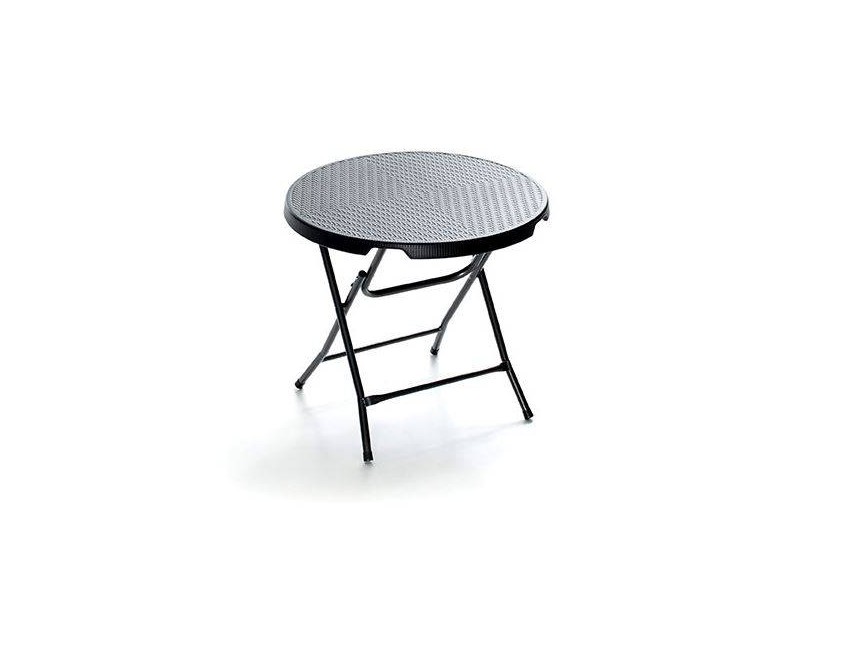 Tavolino da giardino pieghevole tondo con diametro pari a 80 cm, struttura in ferro verniciata a polvere e piano d’appoggio in polyrattan o HDPE (Polietilene Alta Densità), sottoposto a uno speciale trattamento UV.