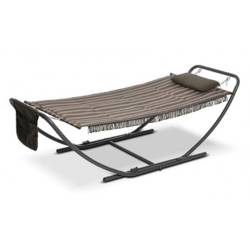 Lettino con supporto pieghevole, compresa di cuscino e rete portaoggetti, struttura in Ferro verniciata a polvere colore antracite, tessuto Polyestere gr 180/mq, colore tessuto rigato beige/marrone cm 238 X 93.5 X 76, paleria ø mm 38.