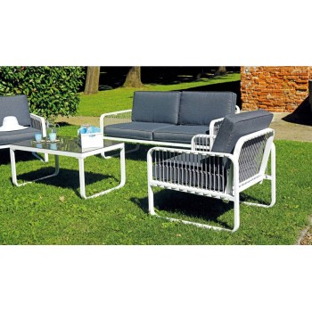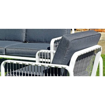 Sofa und Sessel mit Untergestell aus weiß pulverbeschichtetem Aluminium; Sitz und Rückenlehne aus grauem Seil