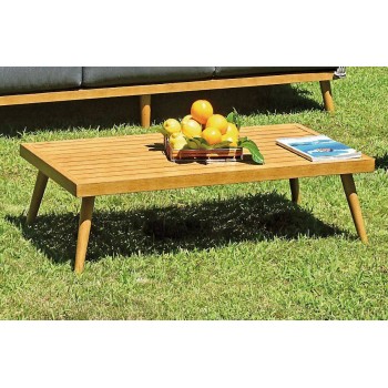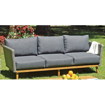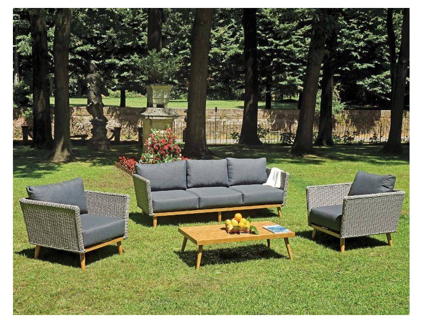 Gartenset bestehend aus einem 3-Sitzer-Sofa, 2 Sesseln und einem niedrigen rechteckigen Tisch.