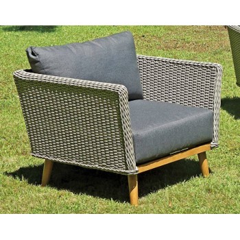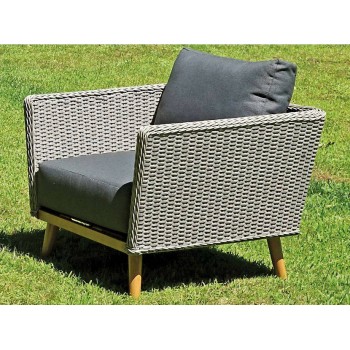 Sofa und Sessel mit Untergestell aus holzähnlichem Aluminium und Weidengeflecht (Doppelweide) aus grauem Polyrattan.
