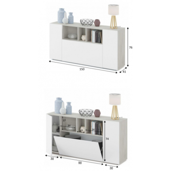 Die Wohnzimmeranrichte sind unverzichtbare und sehr funktionelle Einrichtungsgegenstände. Dank der zwei Türen und der zwei Schubladen ist es möglich, alle Arten von Zubehör jederzeit in Ordnung zu halten. Gleichzeitig passen sie sich perfekt an die verschiedenen Einrichtungsstile der Räume an, in denen sie untergebracht sind.
