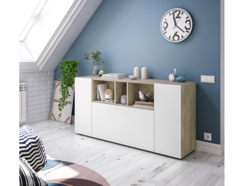 Wohnzimmeranrichte 150x41 cm Mattweiß und Eiche mit 3 Türen