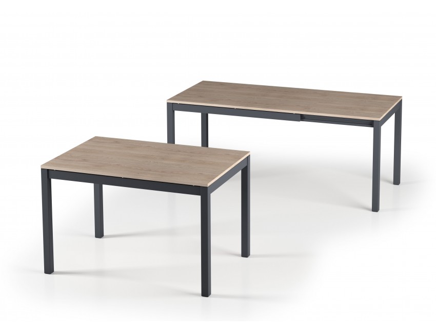 - Dieser Tisch verfügt über einen in die Struktur integrierten Mechanismus: die Beine sind auf einer Seite verschiebbar und ermöglichen die Positionierung der Auszugsplatte in der gleichen Farbe wie die Platte, so dass die Beine immer umlaufend bleiben.