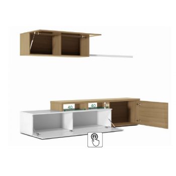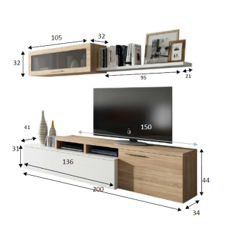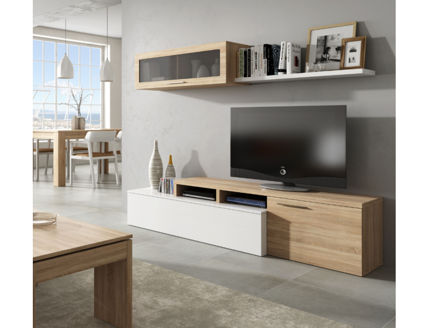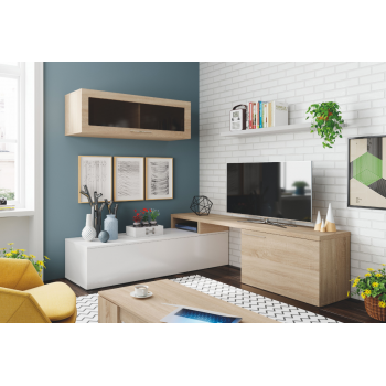 - Zusammensetzung für das Wohnzimmer, bestehend aus einem TV-Schrank mit 2 Türen, einem Hängeschrank mit Glastür und Regal.