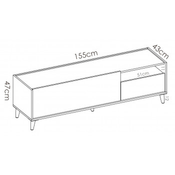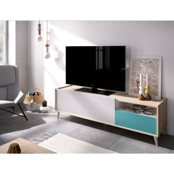 - TV-Schrank geeignet für TV-Geräte bis 65". Ausgestattet mit einer Klappe, einer Schublade und einem Fach.