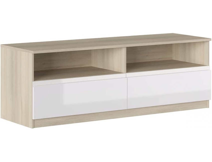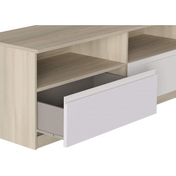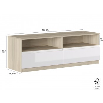 Wohnzimmer TV 160 cm Glänzend Weiß und Eiche mit zwei Schubladen und zwei Fächern Serie Oslo