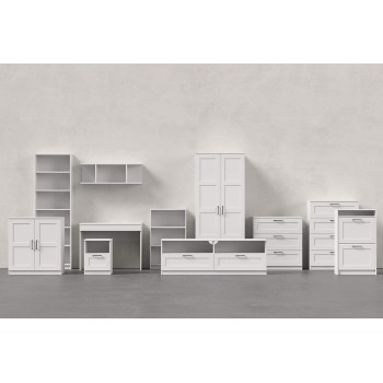 - Abbinabile a tutti i mobili della stessa serie Helsinki : armadio a 2 ante, comodino, cassettiera 3 cassetti, cassettiera 4 cassetti, mobile basso 2 ante, base TV con cassetti, scrivania, mensola, libreria 3 ripiani, libreria 5 ripiani, scarpiera