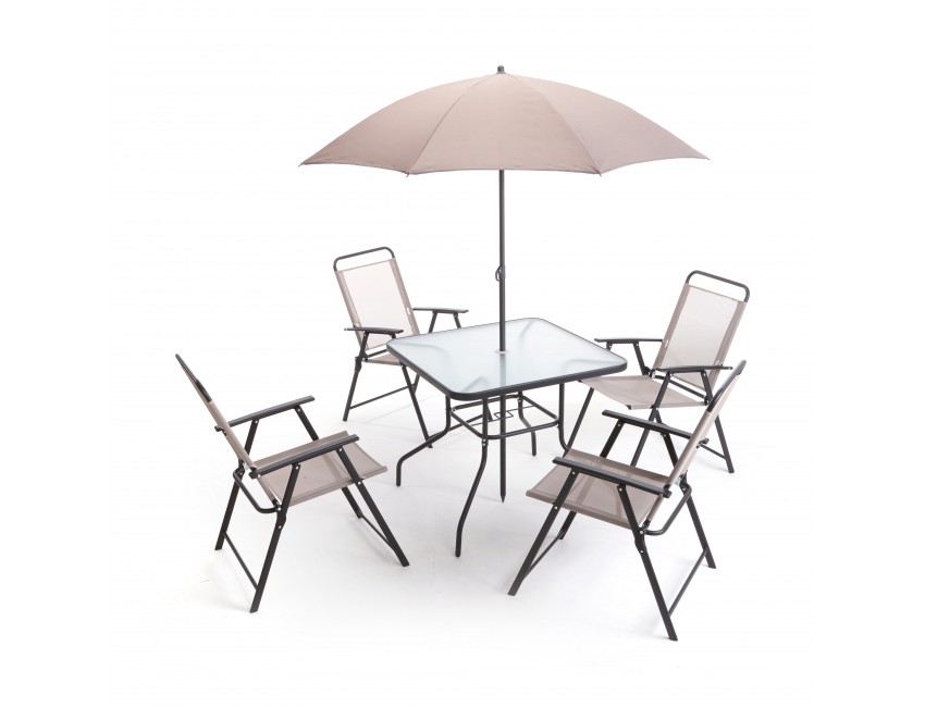 Set tavolo + 4 sedie pieghevoli + ombrellone, struttura tavolo, sedie ed ombrellone in Ferro verniciato a polvere colore nero (finitura opaca), piano in vetro temperato spessore mm 5, tessuto sedie textilene 1×1 colore grigio, tessuto ombrellone 100% Poliestere 140gr/mq colore grigio. Tavolo cm 80 X 80 h 70 (tubolari ø mm 22), Sedia cm 54 X 70 X h 89 (sezione gambe cm 2.8 X 1,4), Ombrellone ø cm 180 X h 205 (8 Stecche), palo ø mm 22/25.
