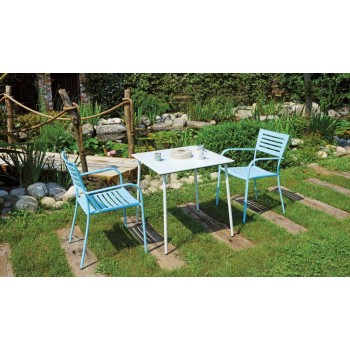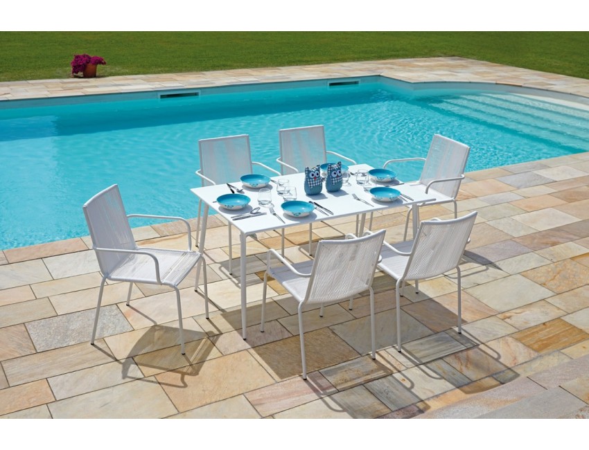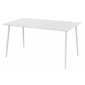 Il tavolo ha un piano rettangolare da 140 x 80 cm e quattro gambe dritte; è interamente realizzato in ferro, verniciato bianco.