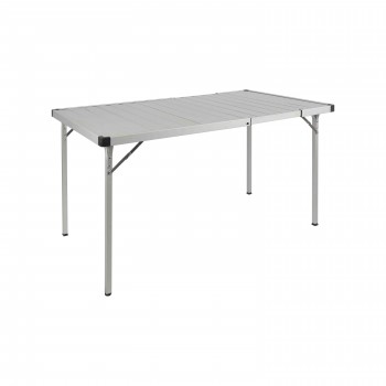 Tavolino da giardino o campeggio pieghevole ed estensibile con struttura in alluminio anodizzato satinato e piano d’appoggio in alluminio anodizzato.