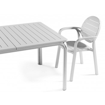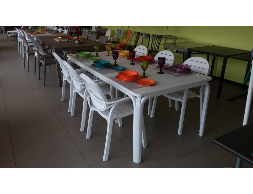 Il piano in Durel-Top del tavolo Alloro è di alto spessore per essere più resistente, inalterabile e robusto, adatto all'utilizzo quotidiano in ambiente esterno. Anche il polipropilene di cui sono composte le sedia Palma è un materiale altrettanto resistente, studiato per essere durevole nel tempo.