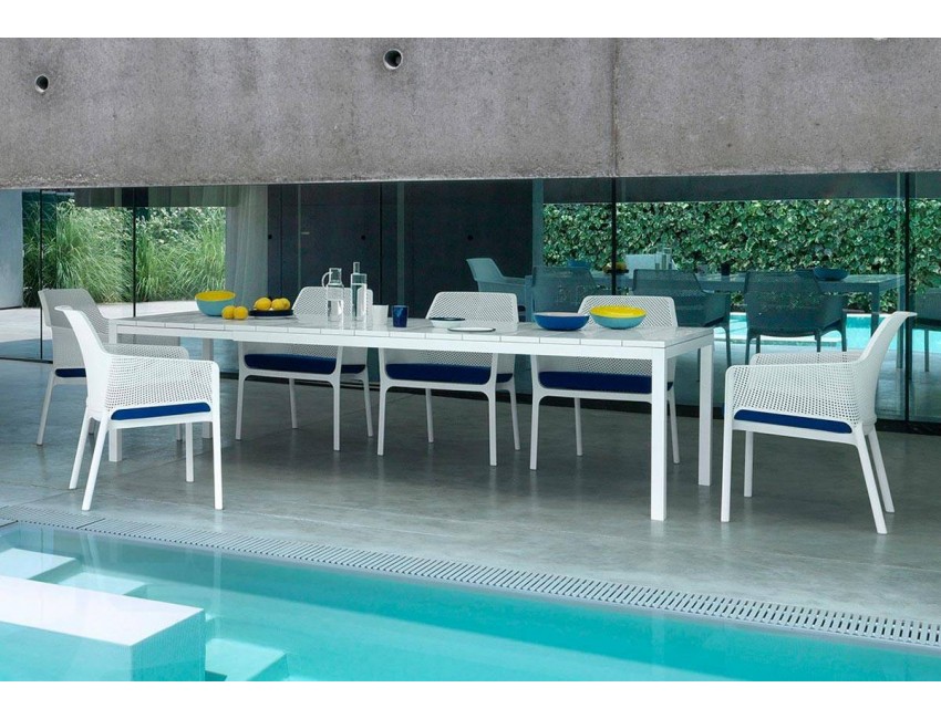 Il tavolo Rio e le sedie Net del set Nardi sono ideali per piacevoli momenti con amici e parenti. Set da pranzo ideale per interno ed esterno casa, veranda e giardino.