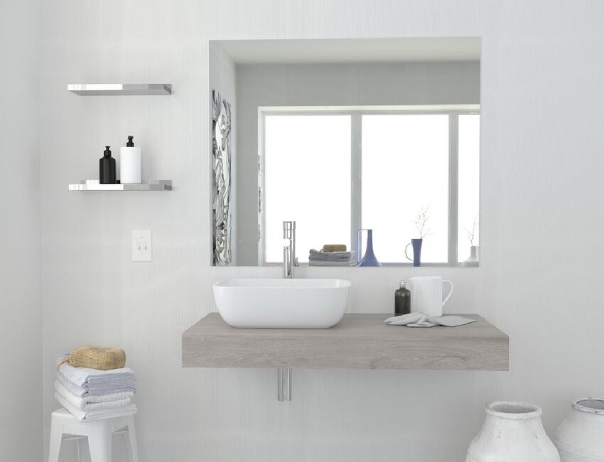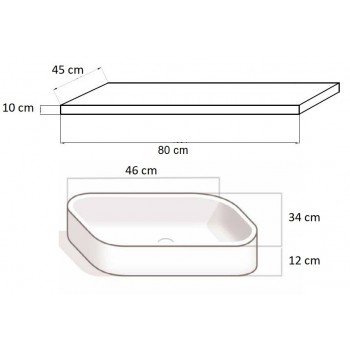 Questa mensola da 80 cm è un piano sospeso per lavabi d'appoggio compatto ed essenziale.