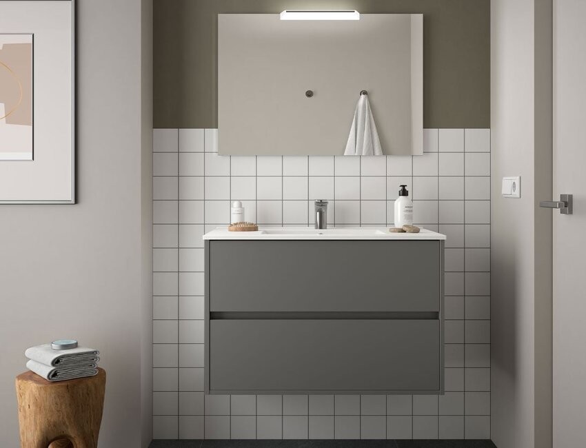 1) Mobile da bagno moderno in legno, colore grigio opaco, con 2 cassetti con chiusura con freno ammortizzato per una chiusura sempre delicata. Maniglia incassata integrata sul frontale del mobile che unisce funzionalità e design. Frontale e laterali fabbricati in truciolare laminato da 16 mm (classe E-1) con bordi in PVC (con colla PUR).