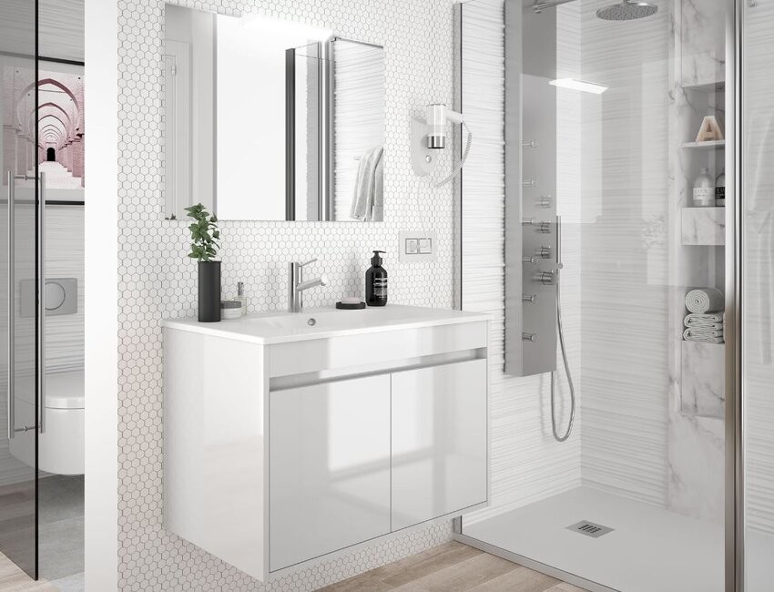 1) Mobile da bagno moderno in legno, colore bianco lucido, con due ante con ammortizzatore per una chiusura sempre delicata. Maniglia incassata integrata sul frontale del mobile che unisce funzionalità e design. Frontale e laterali fabbricati in truciolare laminato da 16 mm (classe E-1) con bordi in PVC (con colla PUR).